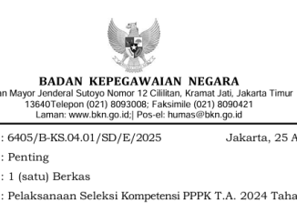 Dasar Surat Wakil Kepala Badan Kepegawaian Negara Nomor : 3673/B-KS.04.03/SD/K/2025 tanggal 21 Juni 2025 Perihal Penyampaian Hasil Seleksi Kompetensi PPPK Tenaga Teknis Tahun Anggaran 2024; Surat Wakil Kepala Badan Kepegawaian Negara Nomor : 4018/B-KS.04.03/SD/K/2025 tanggal […]