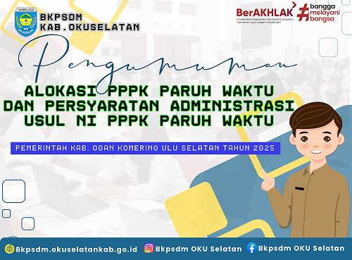Berdasarkan Keputusan Menteri Pendayagunaan Aparatur Negara dan Reformasi Birokrasi Nomor 609 Tahun 2025 tentang Penetapan Kebutuhan Pegawai Pemerintah dengan Perjanjian Kerja Paruh Waktu di Lingkungan Pemerintah Kabupaten Ogan Komering Ulu Selatan dan Surat Kepala Badan Kepegawaian Negara Nomor : 13566/B-SI.01.01/SD/K/2025 tanggal 6 September 2025 perihal Penyampaian Daftar Peserta Alokasi PPPK Paruh Waktu, info selengkapnya klik link dibawah ini :