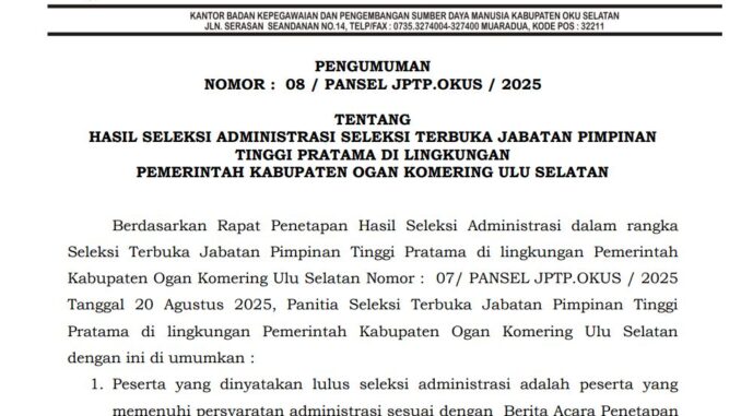 PENGUMUMAN HASIL SELEKSI ADMINISTRASI SELEKSI TERBUKA JABATAN PIMPINAN TINGGI PRATAMA DI LINGKUNGAN PEMERINTAH KABUPATEN OGAN KOMERING ULU SELATAN