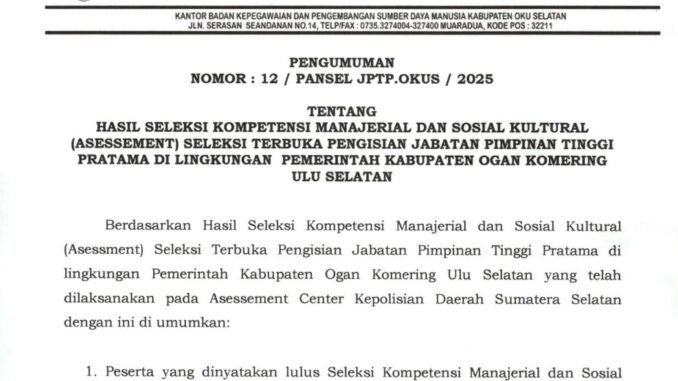 PENGUMUMAN HASIL SELEKSI KOMPETENSI MANAJERIAL DAN SOSIAL KULTURAL (ASESSEMENT) SELEKSI TERBUKA PENGISIAN JABATAN PIMPINAN TINGGI PRATAMA DI LINGKUNGAN PEMERINTAH KABUPATEN OGAN KOMERING ULU SELATAN
