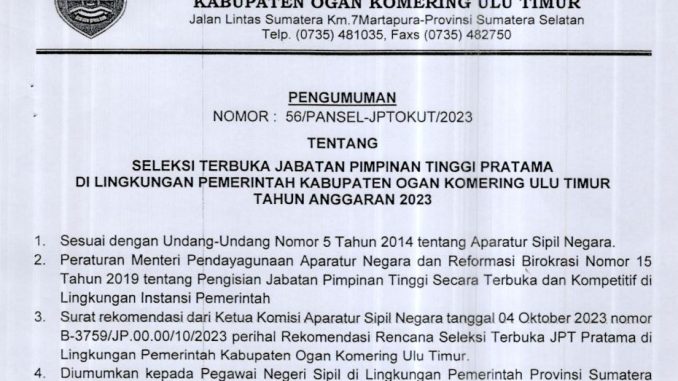 Pengumuman Seleksi Jabatan Pimpinan Tinggi Pratama di Lingkungan Pemerintah Kabupaten Ogan Komering Ulu Timur Tahun Anggaran 2023