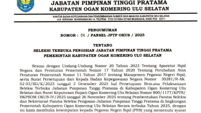serta Surat Persetujuan dan Kepala Badan Kepegawaian Negara Nomor 30281/R-AK02 G3/SD/K/2G25 tanggal 3 Desember 2025 rial Persetujuan Rencana Peiaksanaan Seleksi Terbuka Jabatan Pimpman Tmggi Pratama di Kabupaten Ogan Komenng Ulu Selatan dan Surat Keputusan Bupati Ogan Komenng Ulu Selatan Nomor 800/1177/KPTS/BKPSDM OKUS-1V/2025 tanggal 26 November 2025 tentang Pembentukan Pamtia Seleksidan Sekretanat Pamtia Seleksi Pengisian Jabatan Pimpman Tmggi Pratama di hngkungan Pemenntah Kabupaten Ogan Komenng Ulu Selatan Secara terbuka Tahun 2025, dengan mi kami membuka kesempatan kepada Pegawai Negen Sipii (PNS) yang memenuhi syarat di lmgkungan Pemenntah Kabupaten/Kota se-Provmsi Sumatera Selatan dan Pemenntah Provmsi Sumatera Selatan untuk mengikub Seleksi Terbuka Jabatan Pimpman Tmggi Pratama di lmgkungan Pemenntah Kabupaten Ogan Komenng Ulu Selatan. Untuk Informasi lebih lanjut dapat diunduh disini.