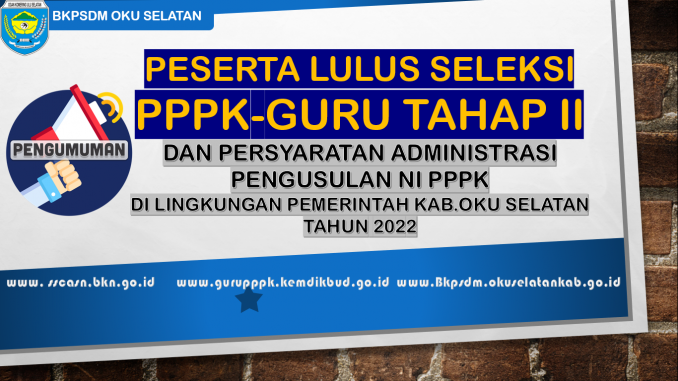 Sehubungan dengan dasar tersebut diatas bersama ini disampaikan Peserta yang dinyatakan lulus kompetensi (data peserta terlampir) dan Persyaratan Pengusulan Nomor Induk Pegawai Pemerintah dengan Perjanjian Kerja Jabatan Fungsional Guru Tahap II di Lingkungan Pemerintah Kabupaten Ogan Komering Ulu Selatan Tahun 2021